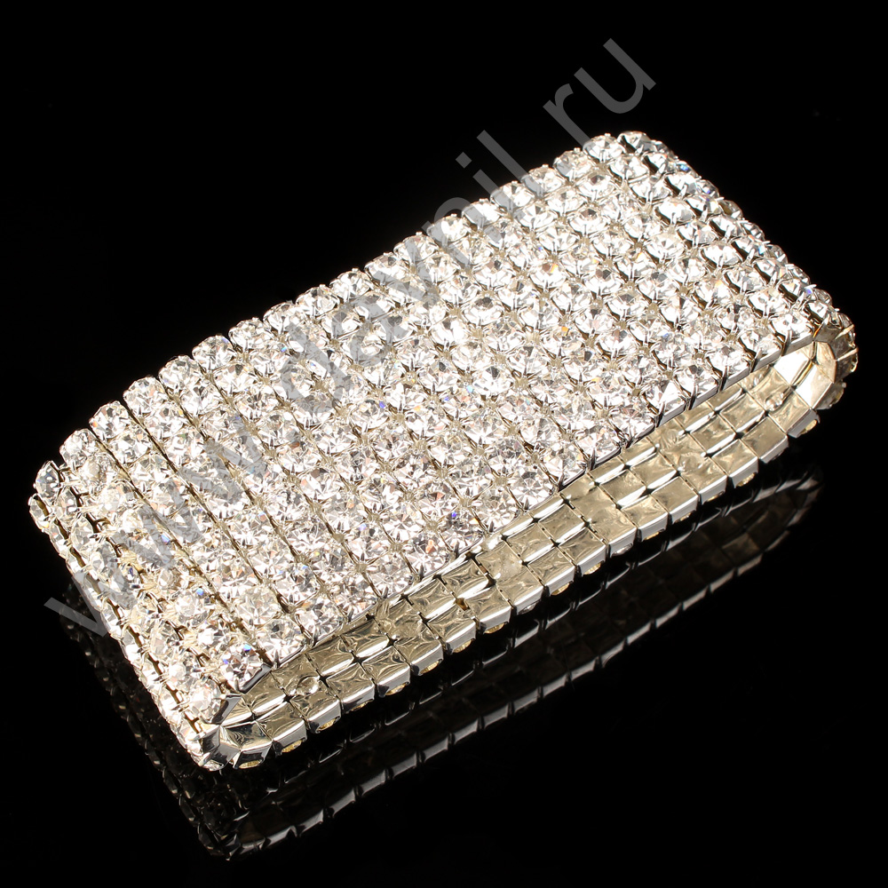 Браслет 9 рядов металлический со стразами серебро