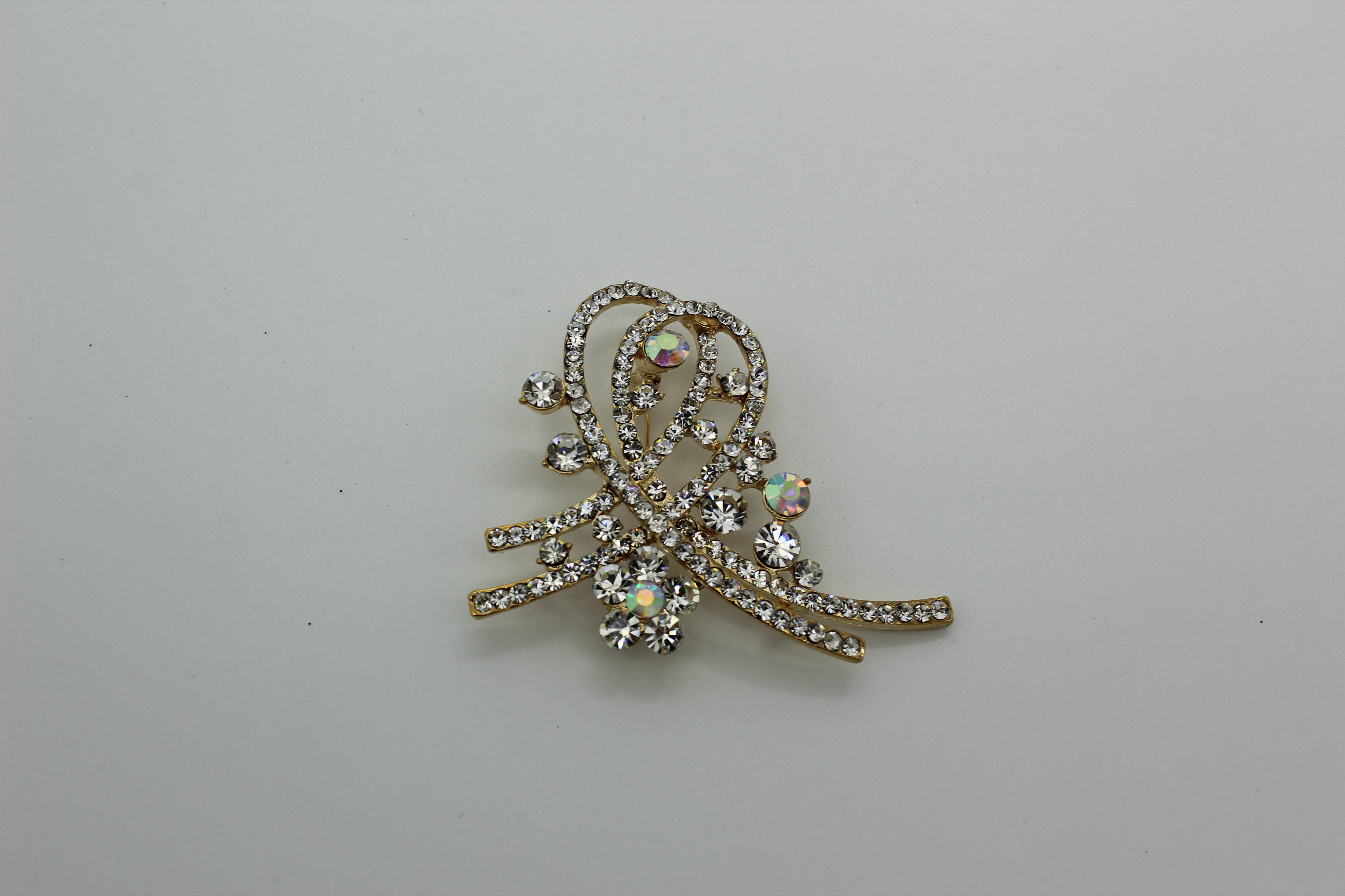 Брошь со стразами двойная линия в переплетении с цветком золото