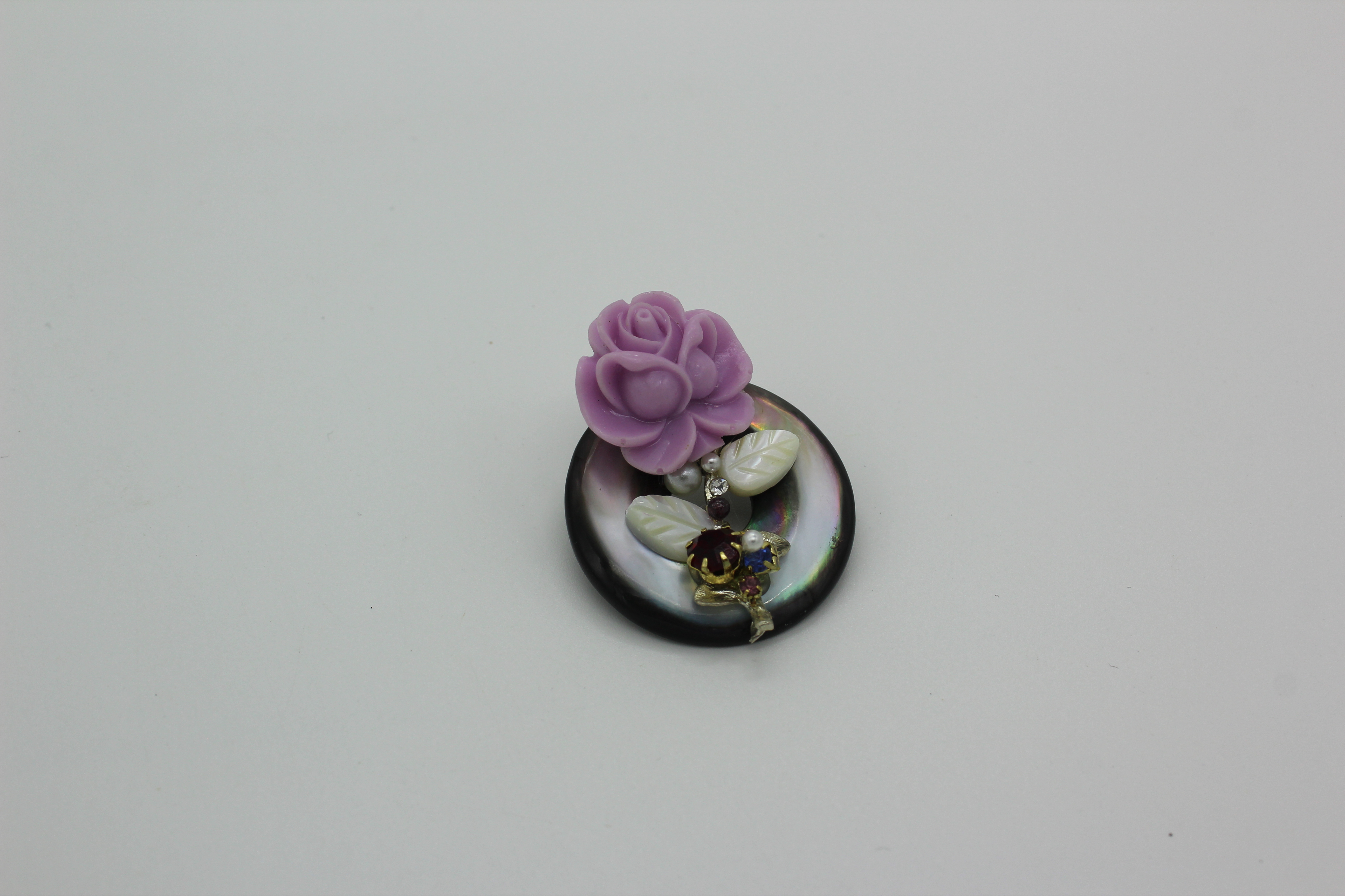 Брошь с натуральным камнем перломутр с сиреневым цветком