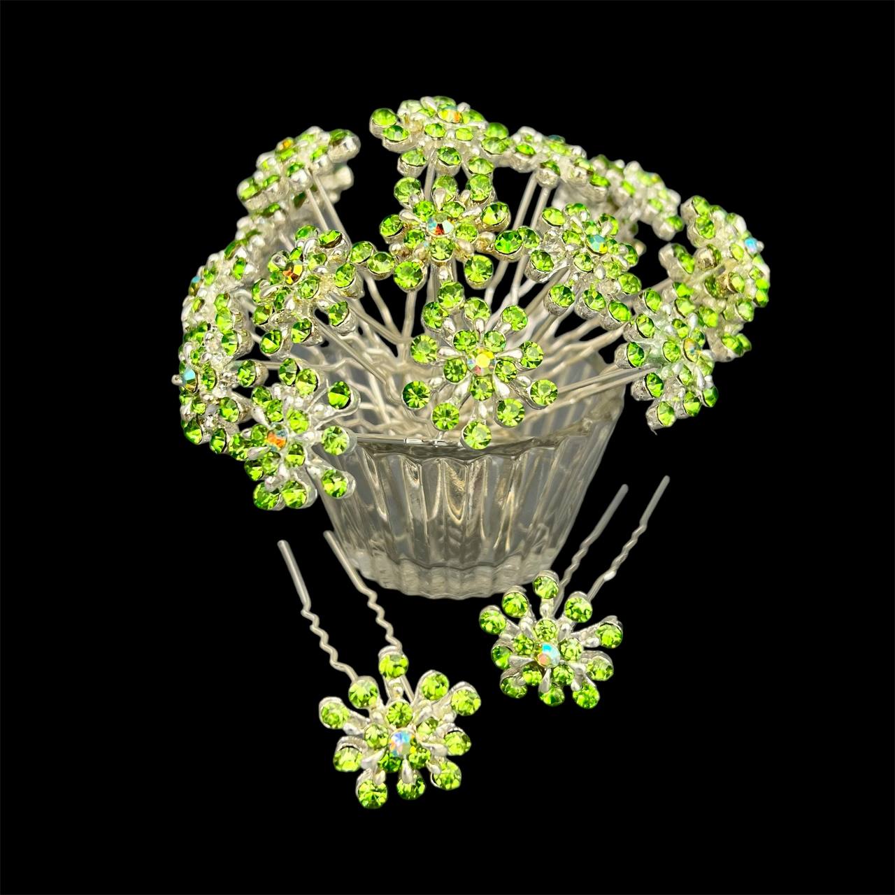 Шпильки для волос хризантема  со стразами  20 шт зеленые 31/3