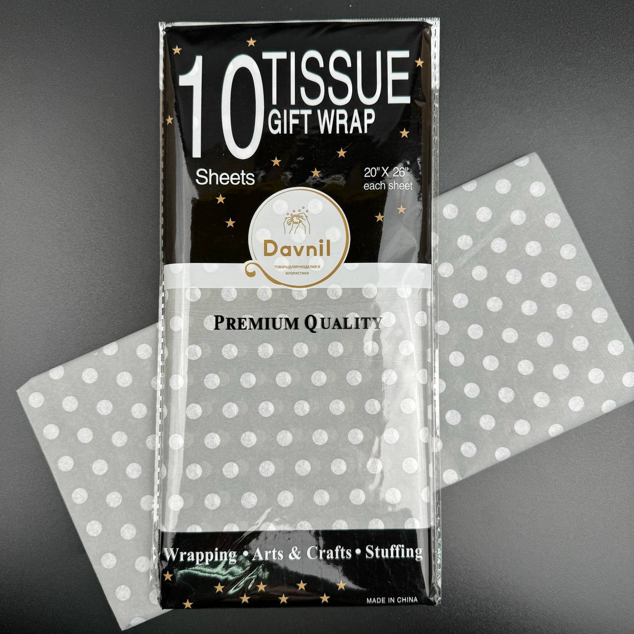 Бумага тишью 50*66 см 10 шт в мелкий горох серая 9