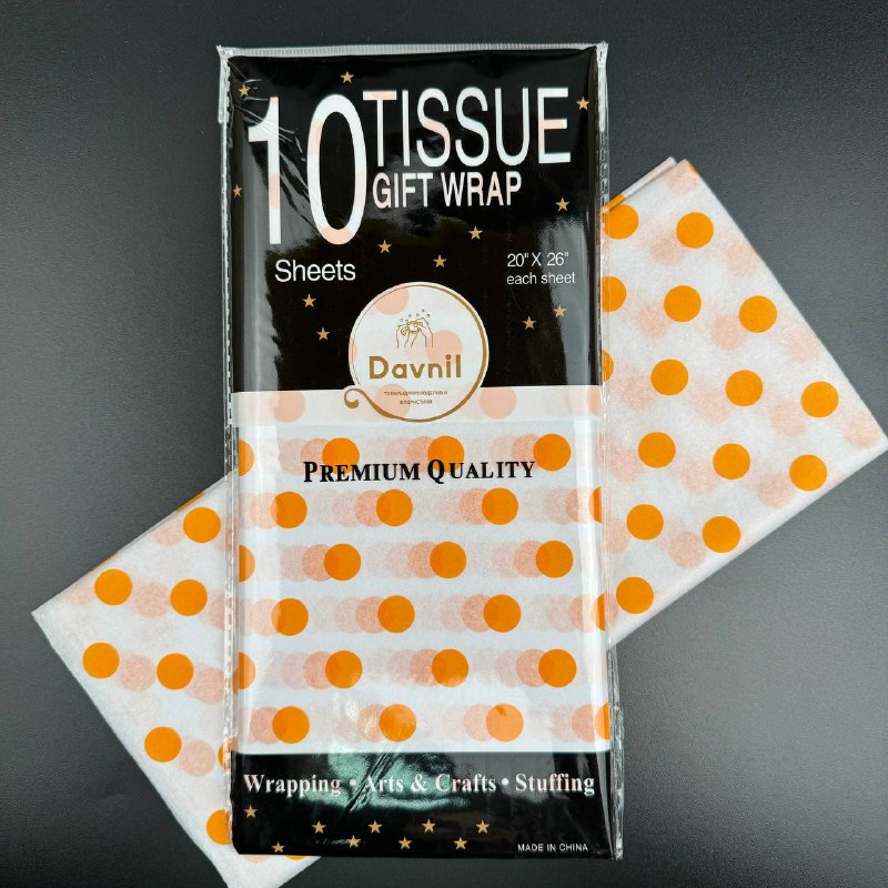 Бумага тишью 50*66 см 10 шт с оранжевым горохом белая 1