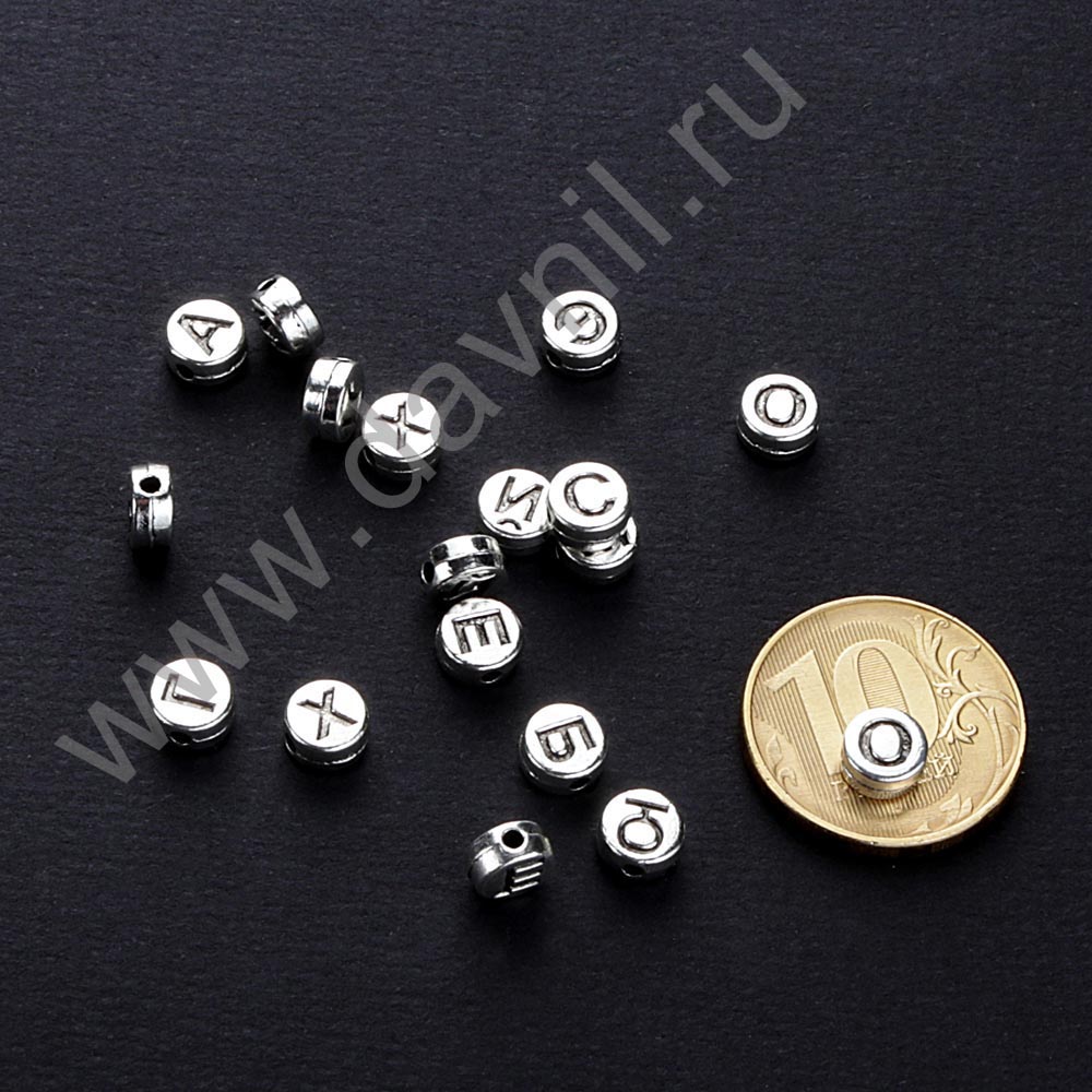 Бусины 6 мм 50 гр буквы круглые серебряные