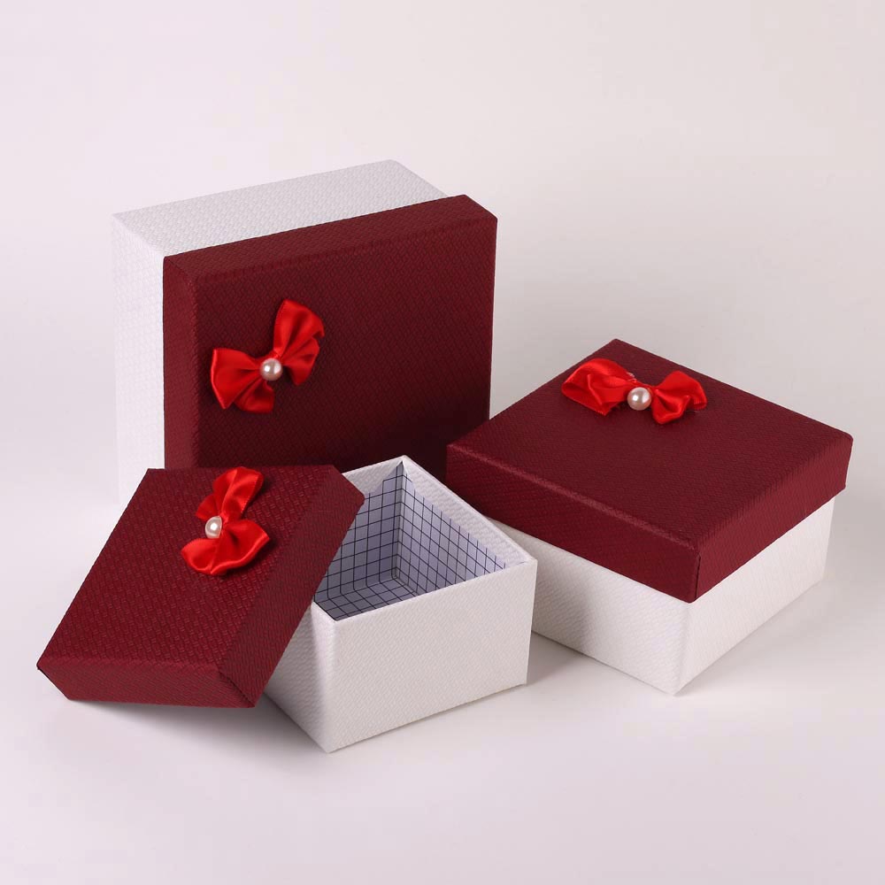Набор коробок 13,5*13,5*7,5 см рогожка 3 шт бело-бордовый с бантом