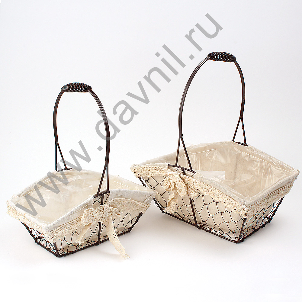 В 1 наборе 2 кашпо разного размера в виде металлических корзин с ручками в льняных чехлах.