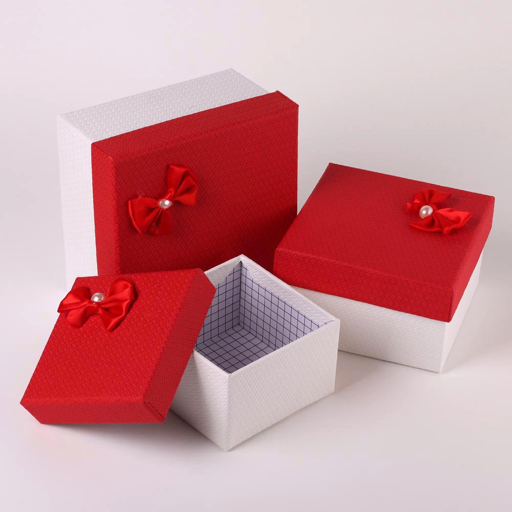 Набор коробок 13,5*13,5*7,5 см рогожка 3 шт бело-красный с бантом
