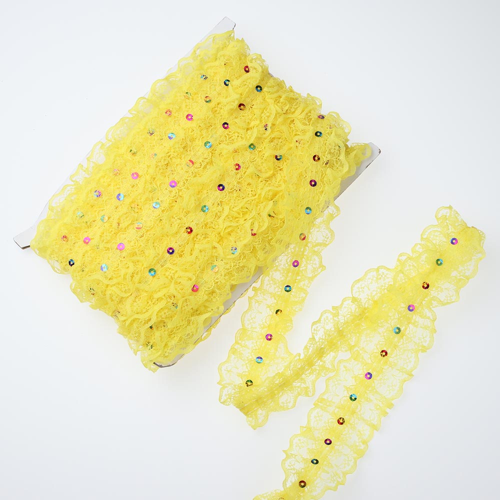 Тесьма 4 см 10 яодов капроновая рюшечка жёлтая с пайетками