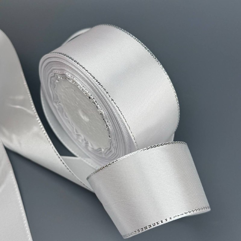 Лента атласная с серебряным люрексом 4 см 20 ярдов белая 001