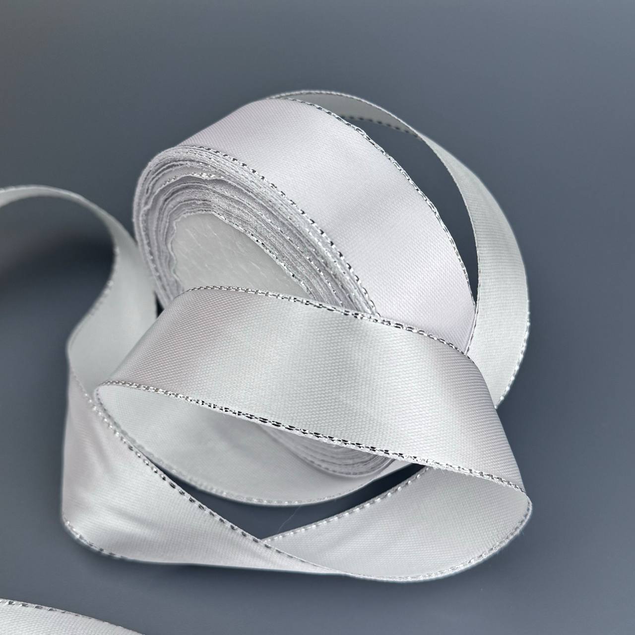 Лента атласная с серебряным люрексом 2,5 см*20 ярдов белая 001