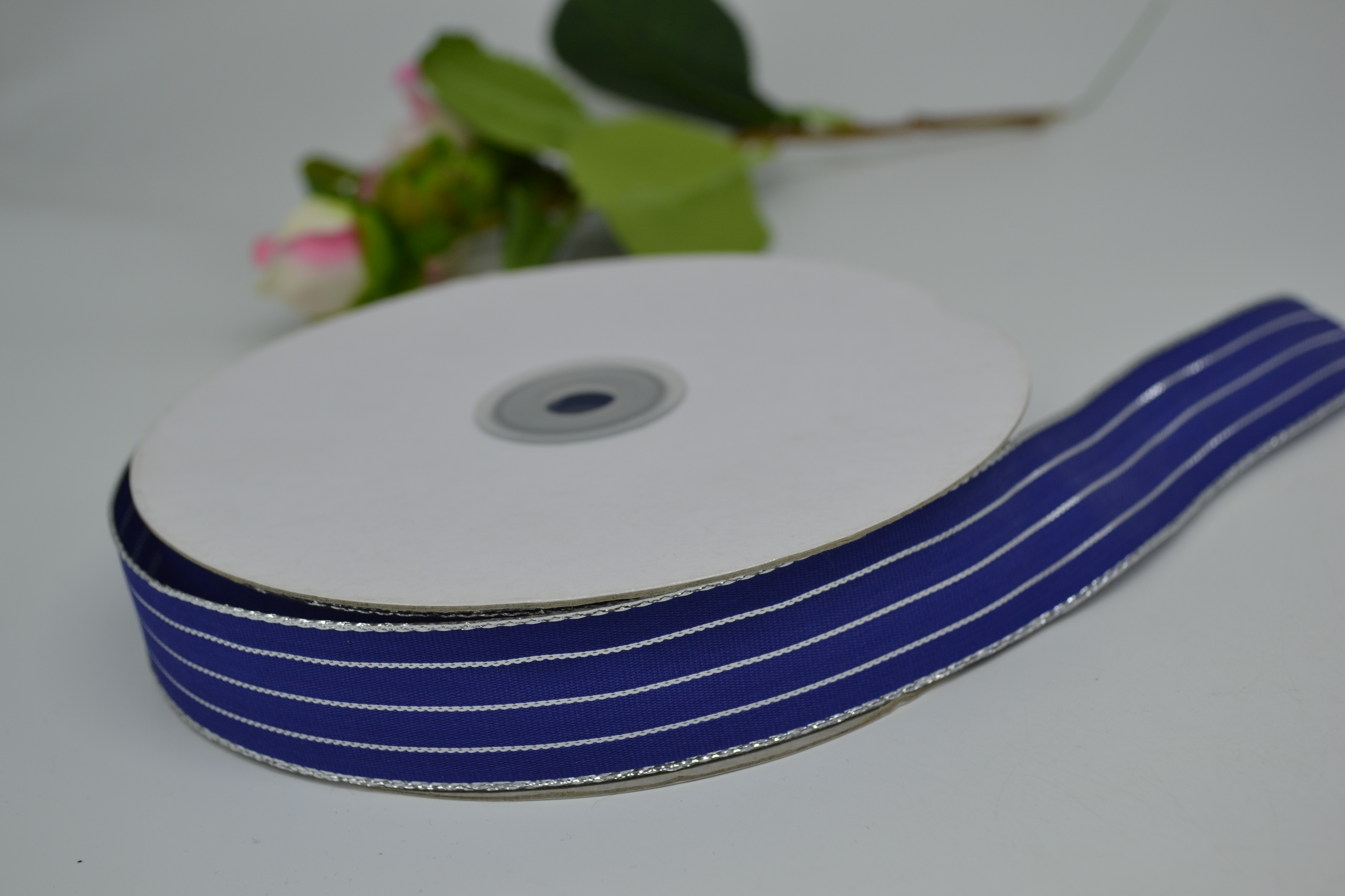 Лента сетка 2,5 см 50 ярдов серебро с синей окантовкой