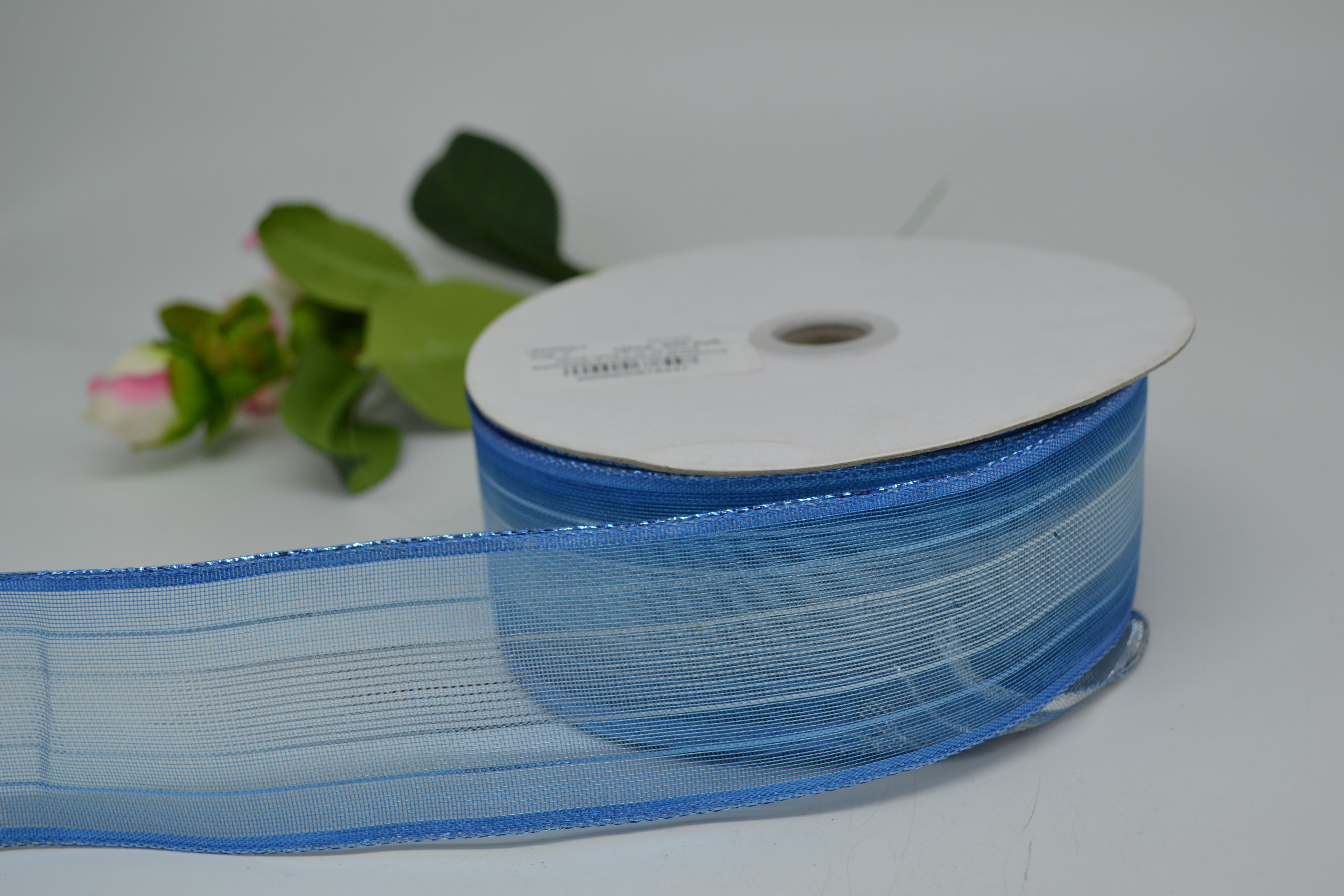 Лента сетка 5 см 30 ярдов серебро в синюю полосочку