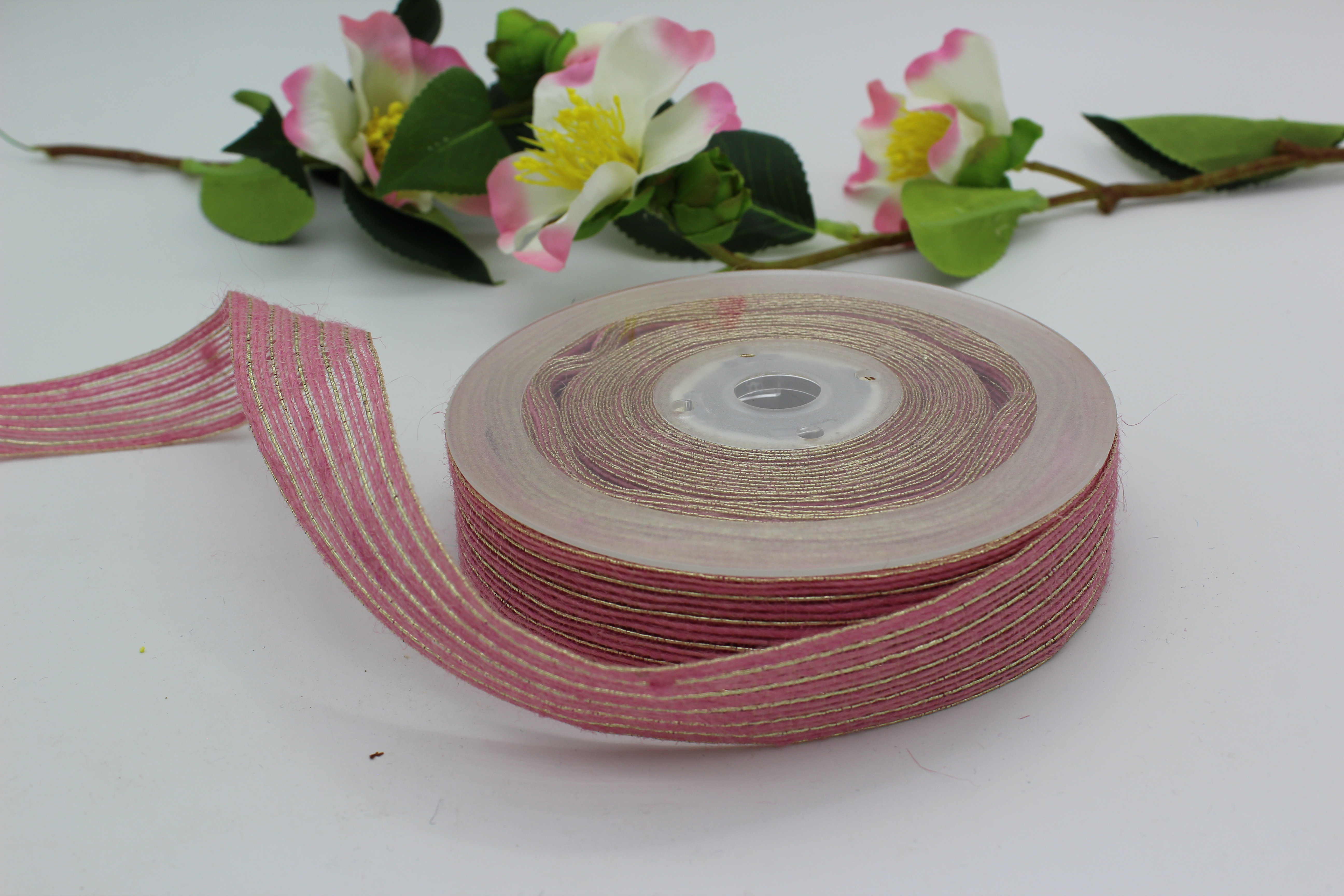 Лента мешковина 2,5 см с серебрянным люрексом розовая