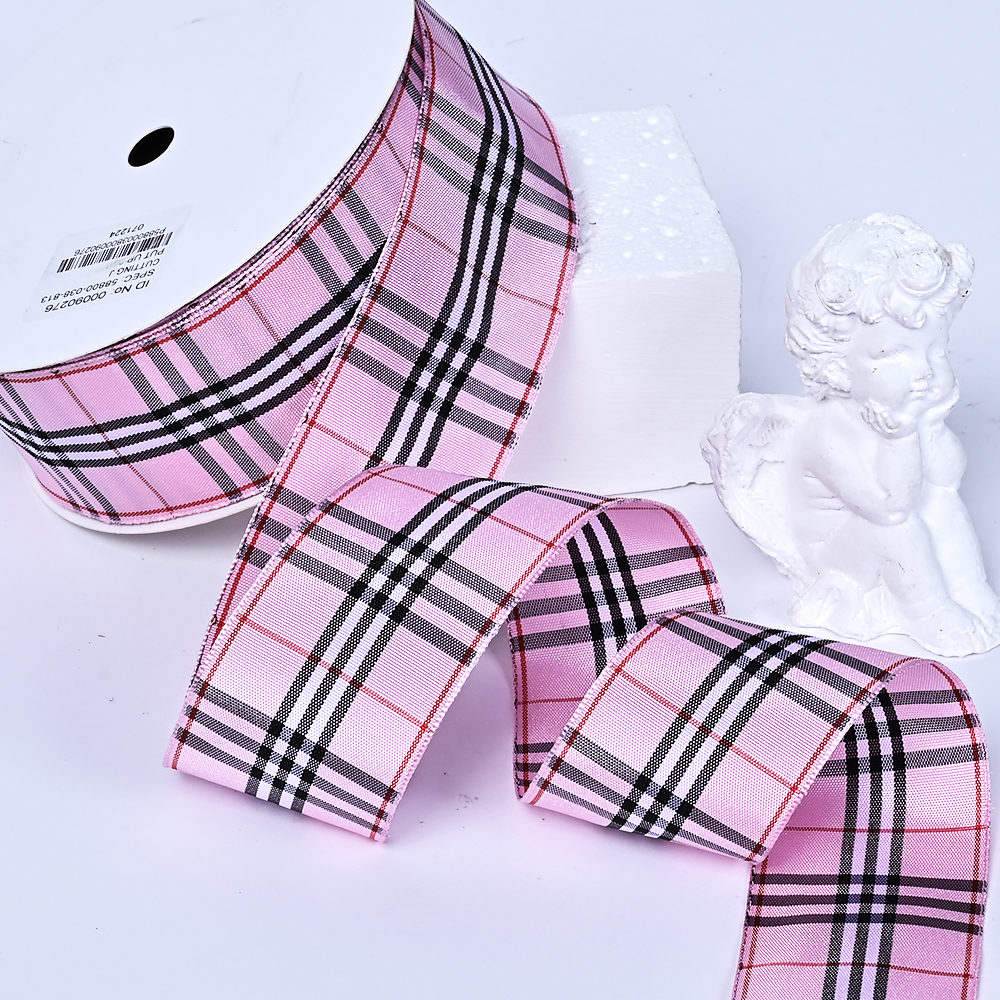 1-1/2"(38mm)Gingham Ribbon B005 лента тканевая в клетку 10 ярдов розовая