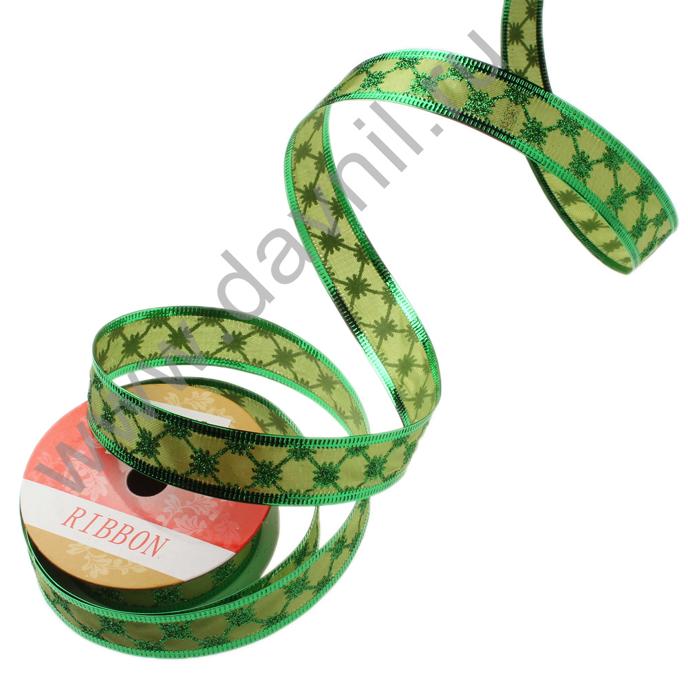 Лента декоративная с проволочным краем 2,5 см* 2,7 м зелёная 7/4