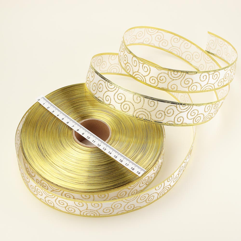 Лента декоративная с проволочным краем 3,8 см 100 ярдов белая золотые завитки 0002