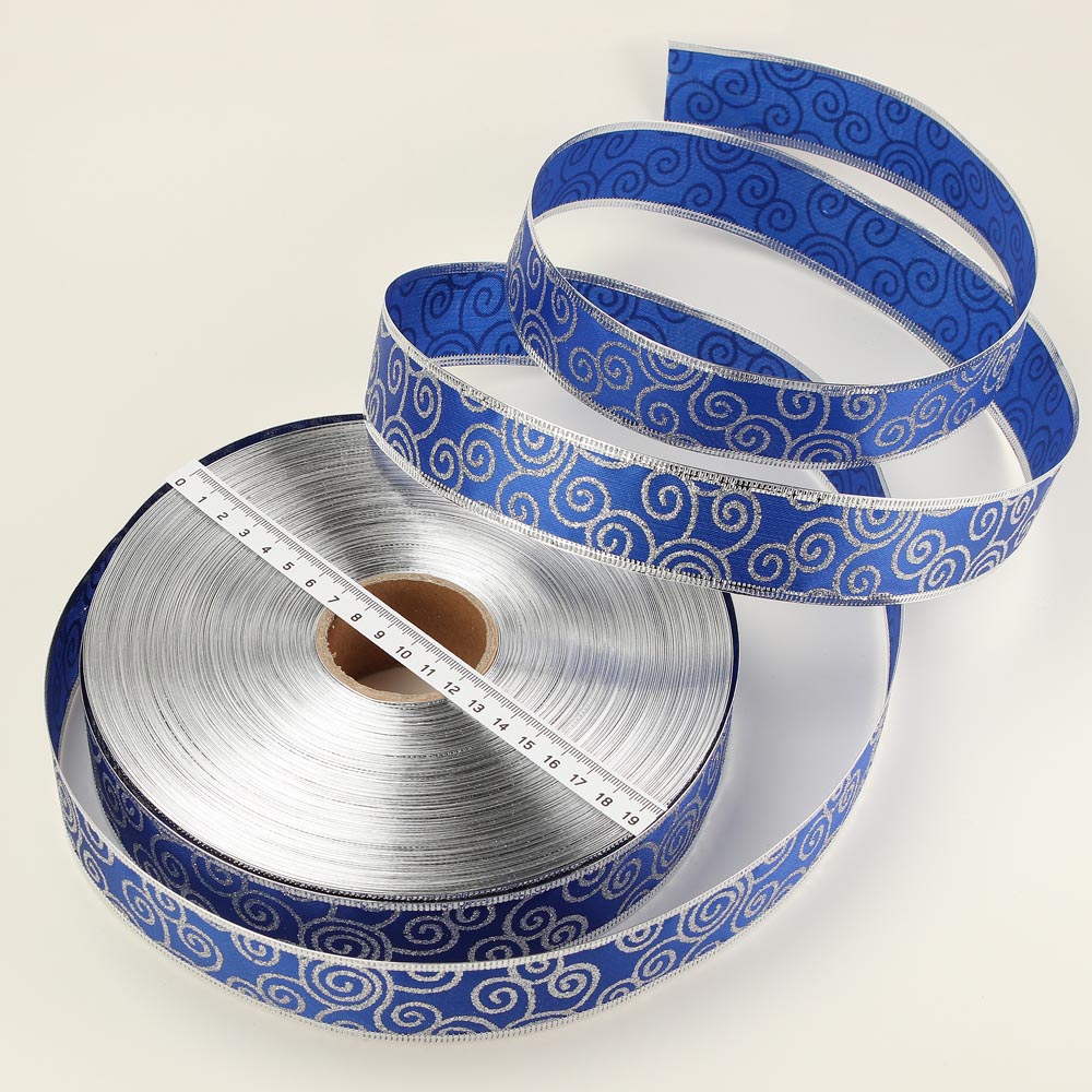 Лента декоративная с проволочным краем 3,8 см 100 ярдов синяя серебряные завитки 0040