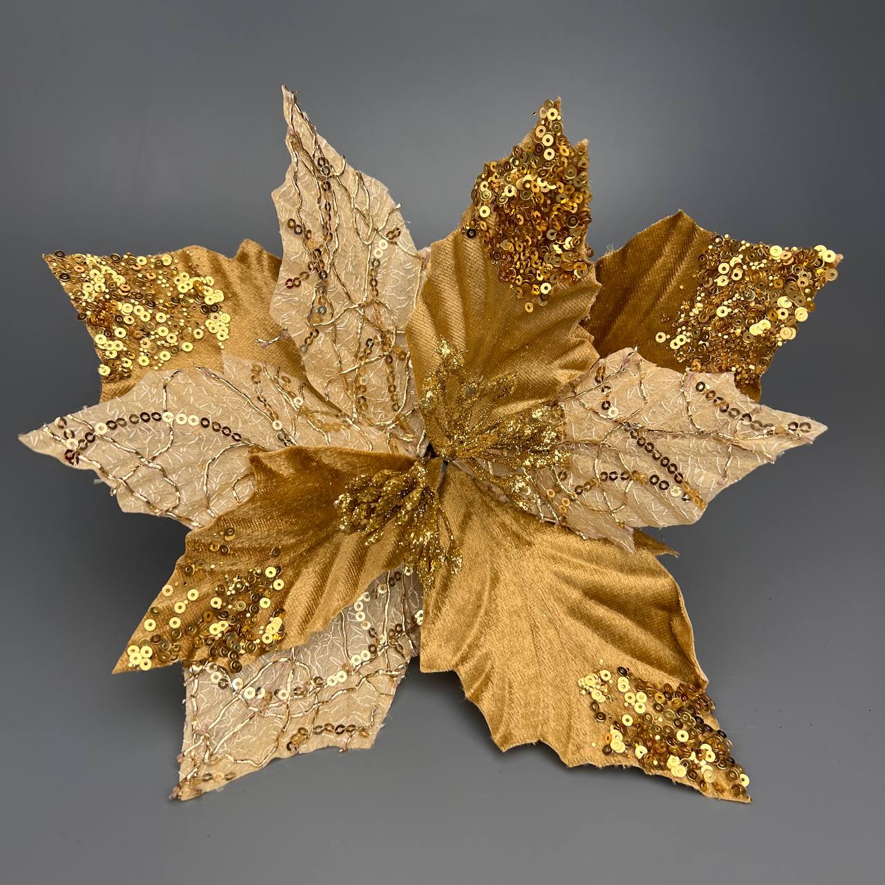 Цветок декоративный бархатный 26 см бежевый с пайетками