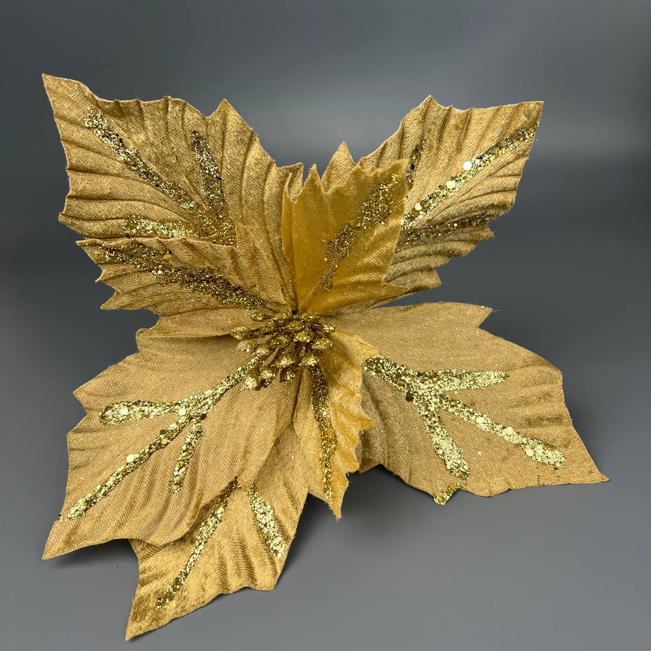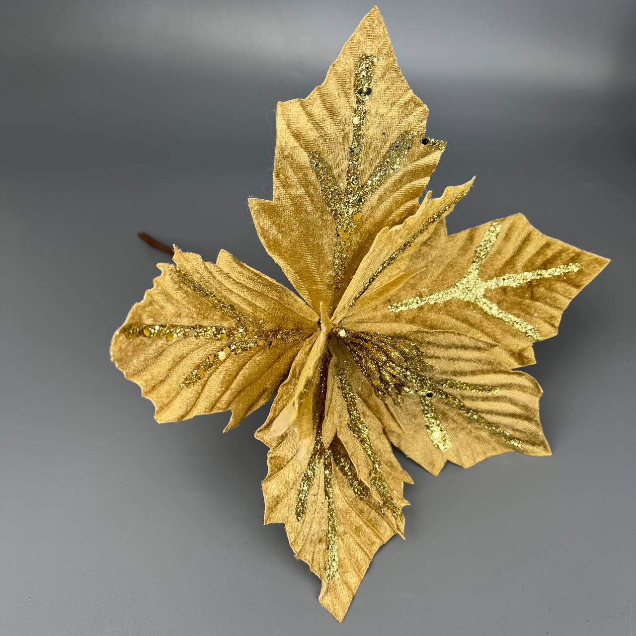 Цветок декоративный бархатный 24 см золото с глитером 2