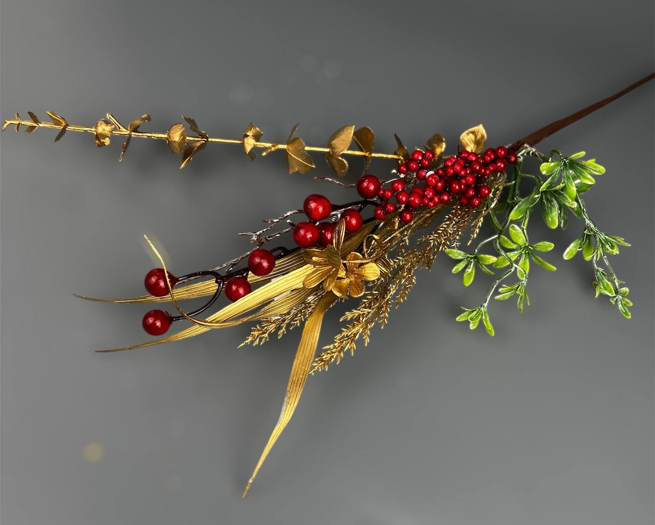 Новогодняя декоративная веточка (JM25381) 55 см Золотая веточка с рябиной