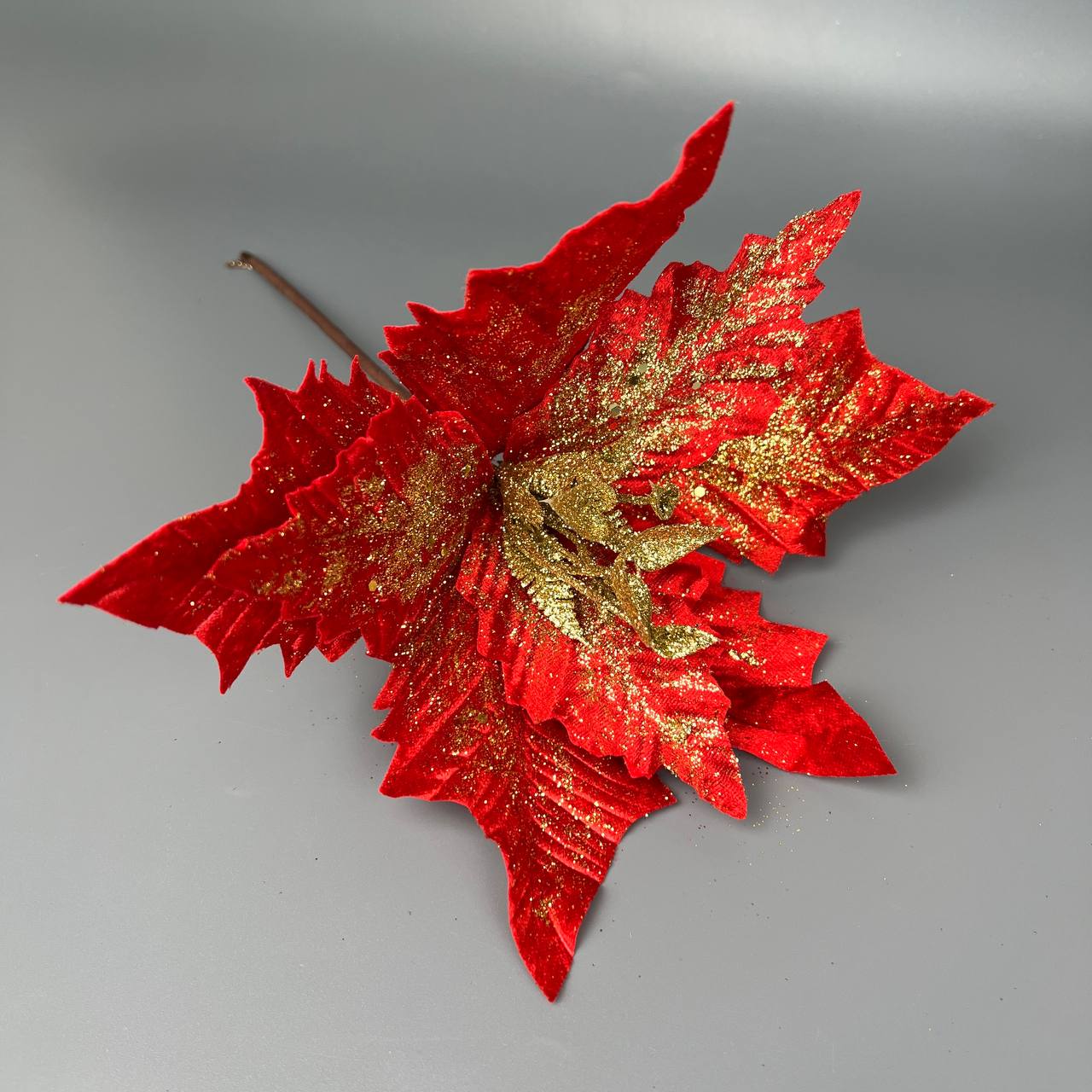 Цветок декоративный бархатный 26 см красный с золотым глитером 3