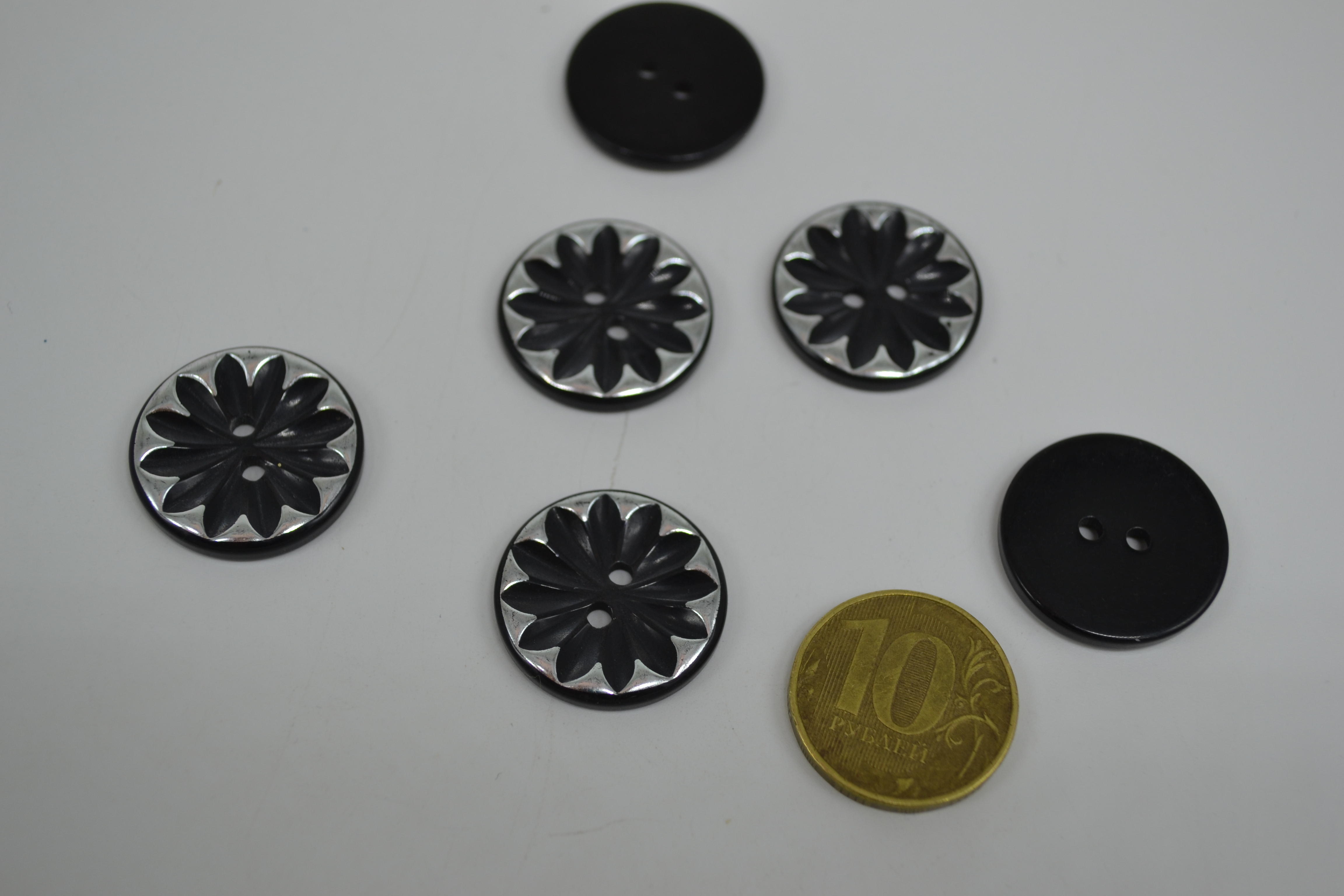 Пуговица 22 мм чёрная с окантовкой серебряного цветка 10 шт