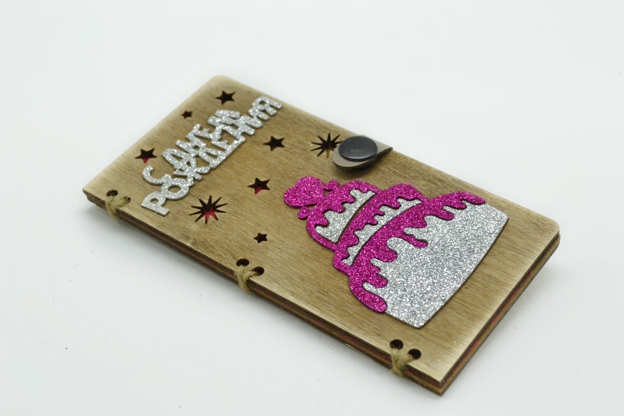 Конверт деревянный " Глитерный торт серебряный с фуксией "