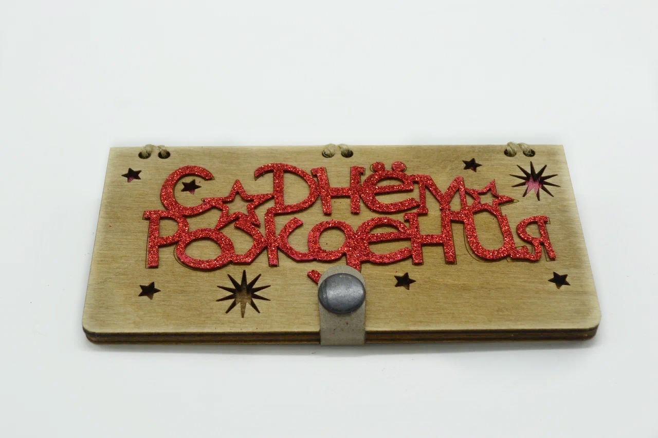 Конверт деревянный " С днём рождения ! " красный глитер