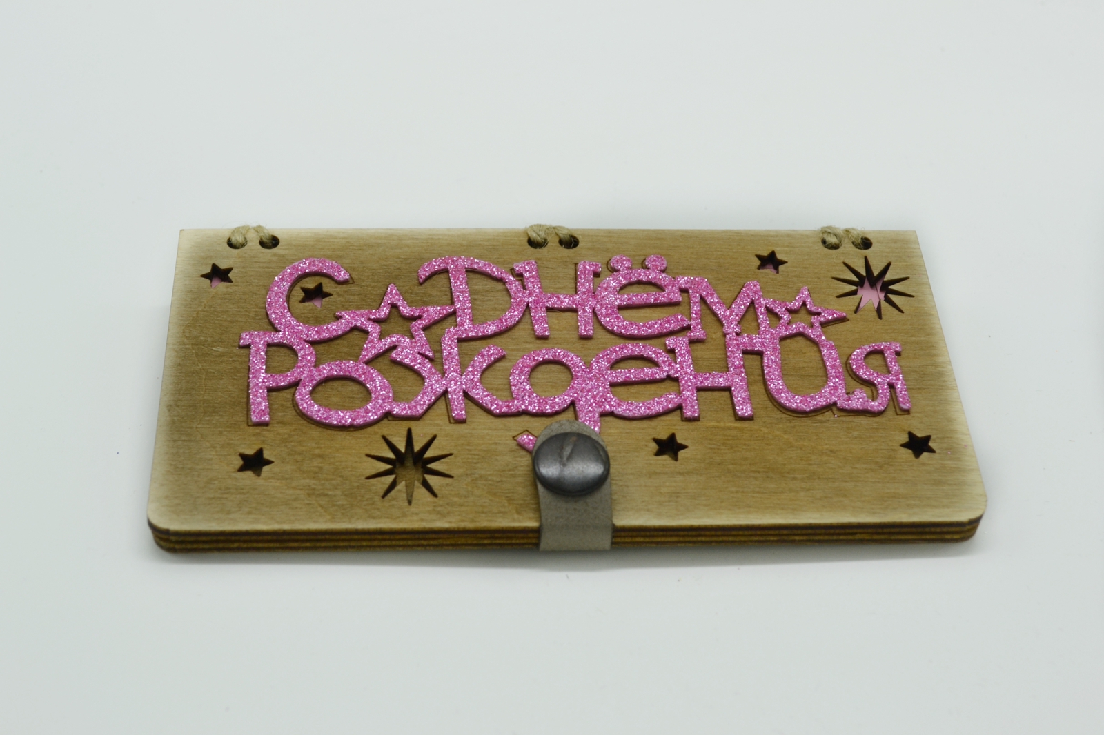 Конверт деревянный " С днём рождения ! " розовый глитер