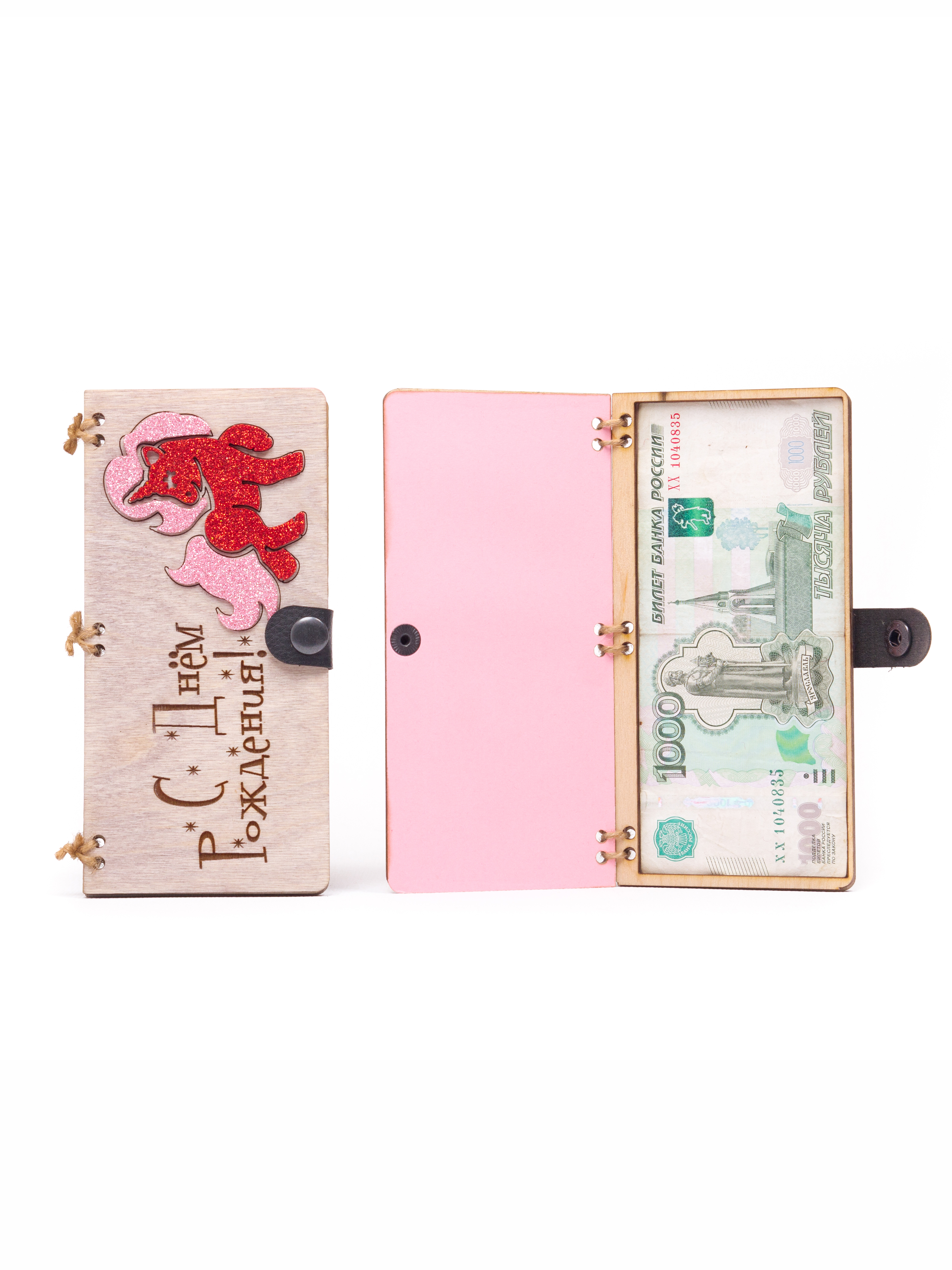 Конверт деревянный " С днём рождения (Единорог) " красный