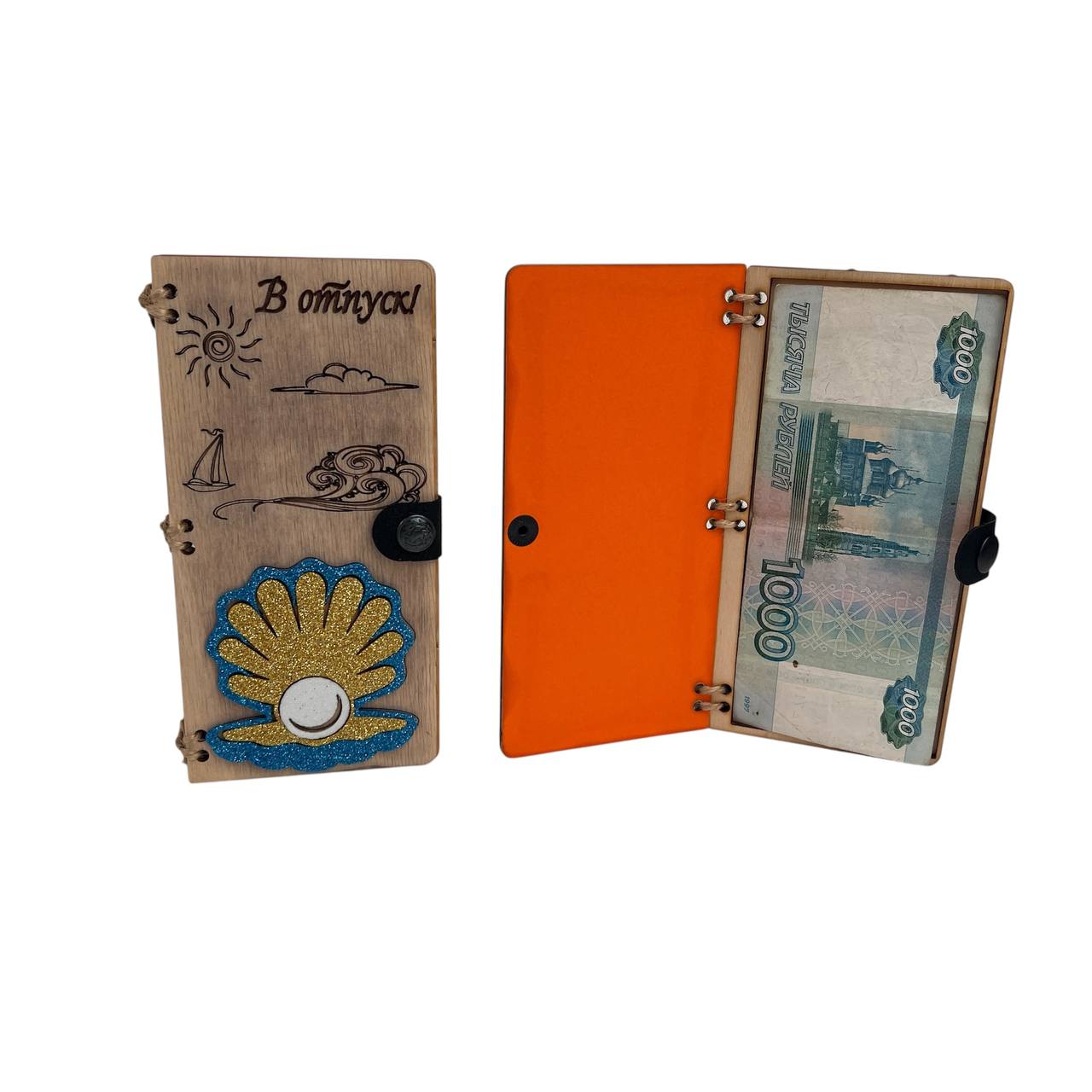 Конверт деревянный "В отпуск" с ракушкой из глиттера жёлтая